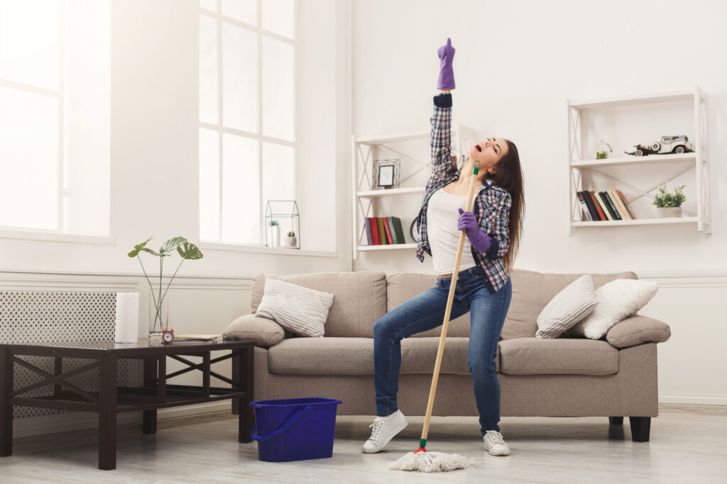 Mujer feliz limpiando la casa, bailando con un paño y divirtiéndose, copiando el espacio. El concepto de quehaceres domésticos, tareas domésticas.
